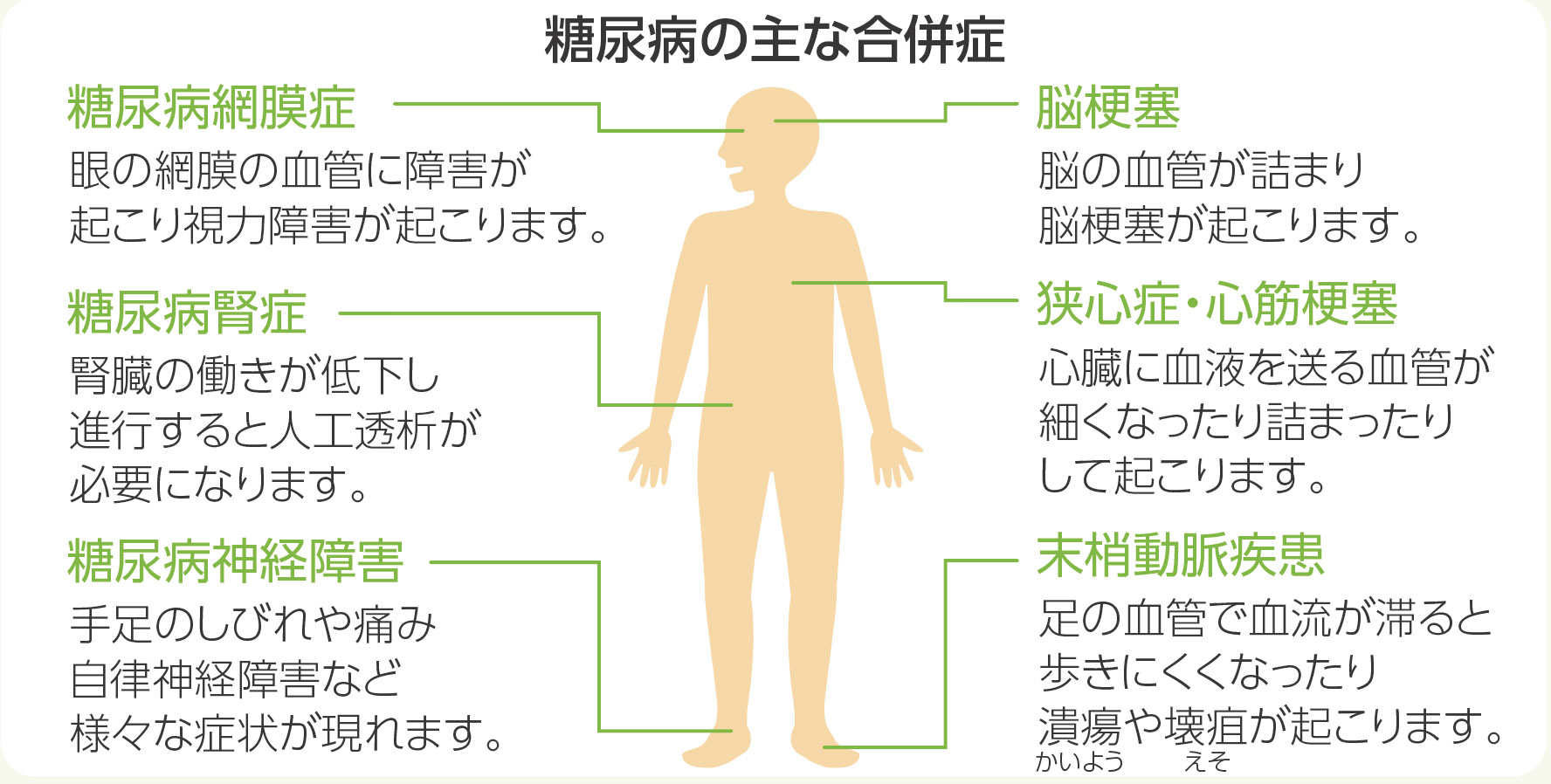 糖尿病そのものは、実は目立った症状のない人がほとんどです。そのため、かなり進行して合併症が出るまで放置してしまうことも少なくありません。糖尿病の合併症は全身にわたり、中には生命に関わったり、手や足の切断、失明、透析導入など、それまでの日常生活が送れなくなるほどの障害を引き起こすものもあります。これが糖尿病の怖いところです。