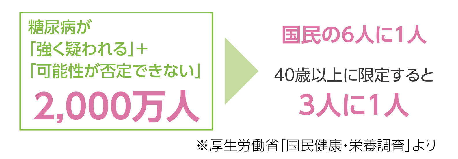 日本国内の糖尿病患者数は、「強く疑われる」と「可能性が否定できない」を合わせて2,000万人と推計され、国民の6人に1人という高い数字となっています。